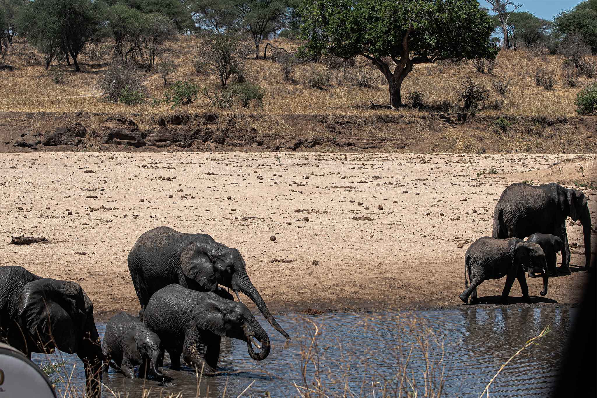 Tarangire National Park (2,850 km²): 140 km southwest of Arusha. Rolling golden hills stitched with Africa’s greatest concentration of ancient baobabs and the seasonal Tarangire River. Dry-season elephant super-herds of 3,000+ animals (June–October peak) share waterholes with leopard-rich sausage trees.