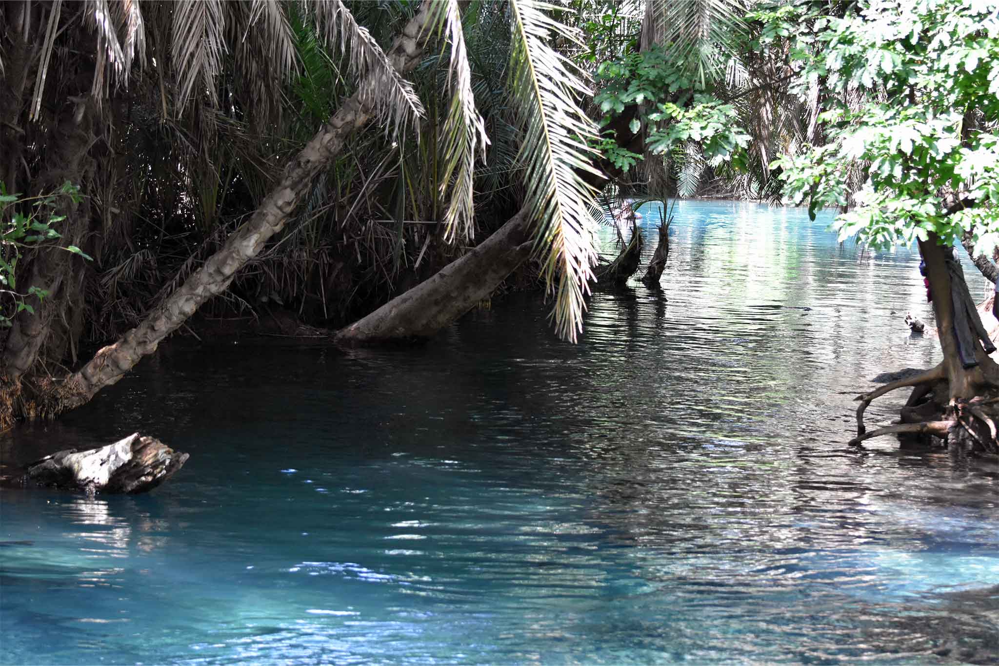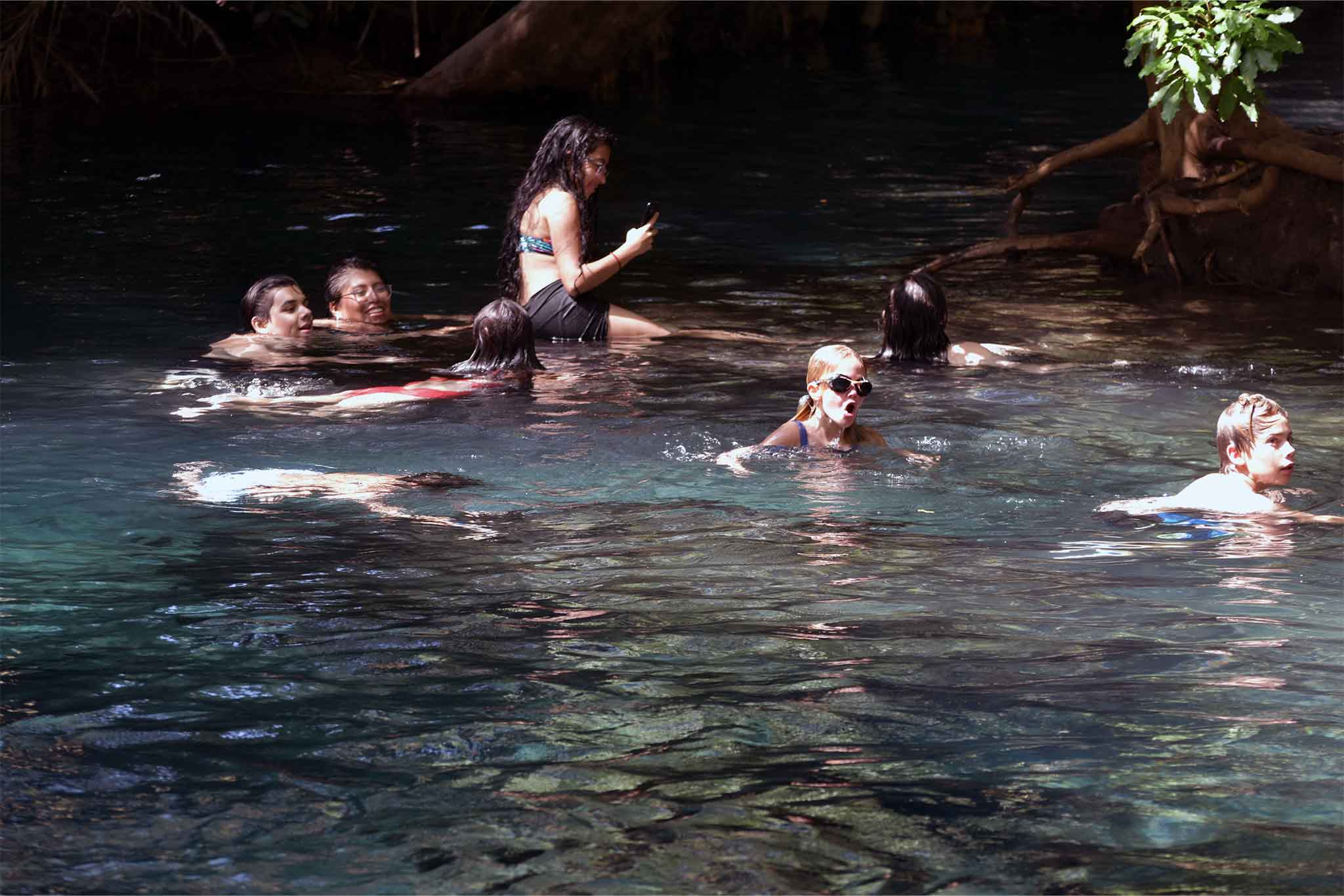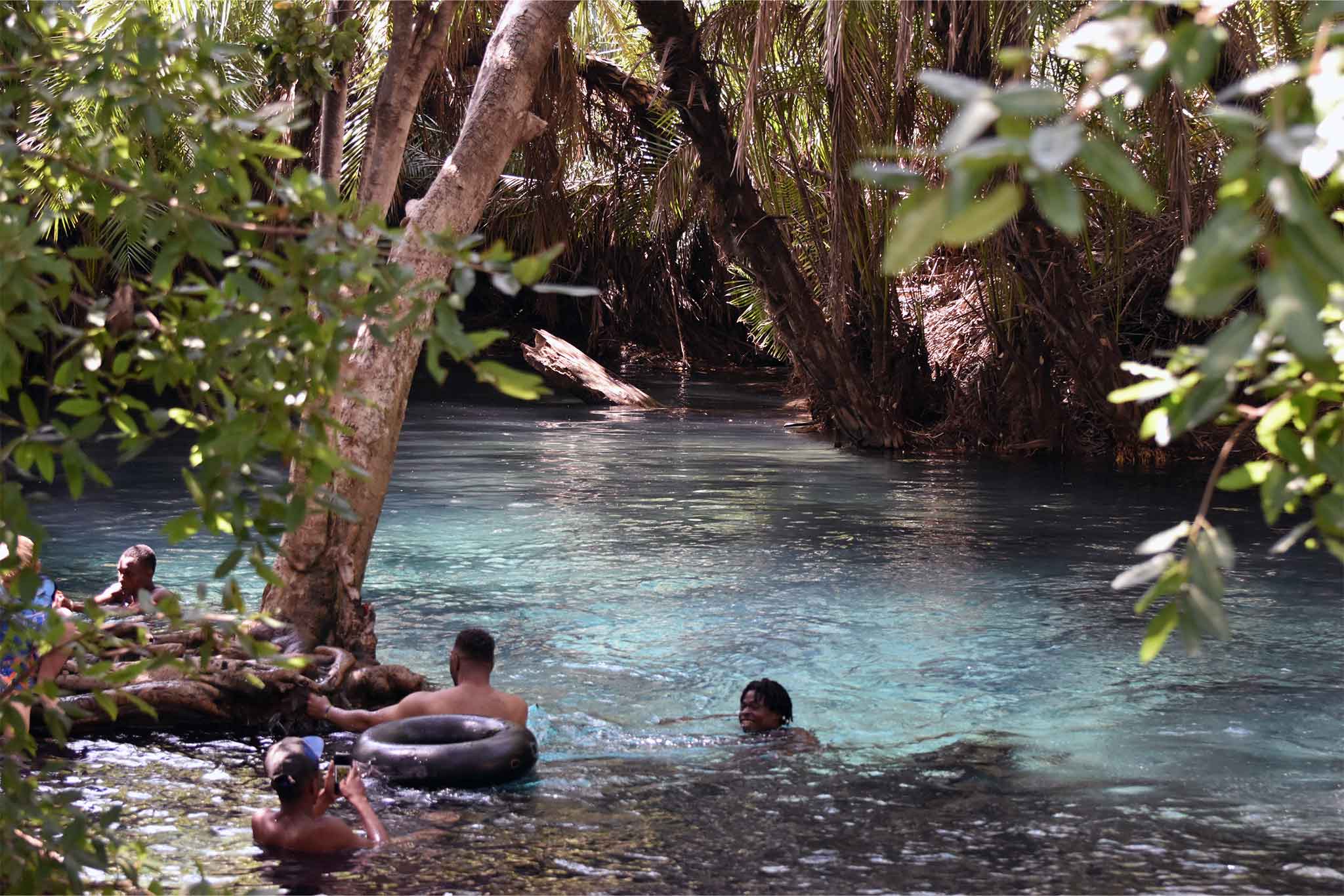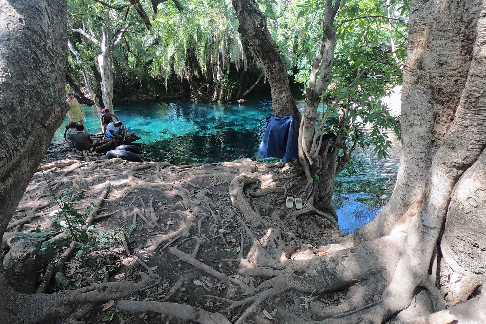 Walk through a short palm-lined path to reach the hidden oasis. Dive into the year-round 28–30 °C warm, turquoise spring water that stays perfectly clear and refreshingly clean due to constant natural filtration. Swim among thousands of tiny fish, swing from the famous rope swing into the deepest pool, or simply float under the canopy of giant fig and fever trees.