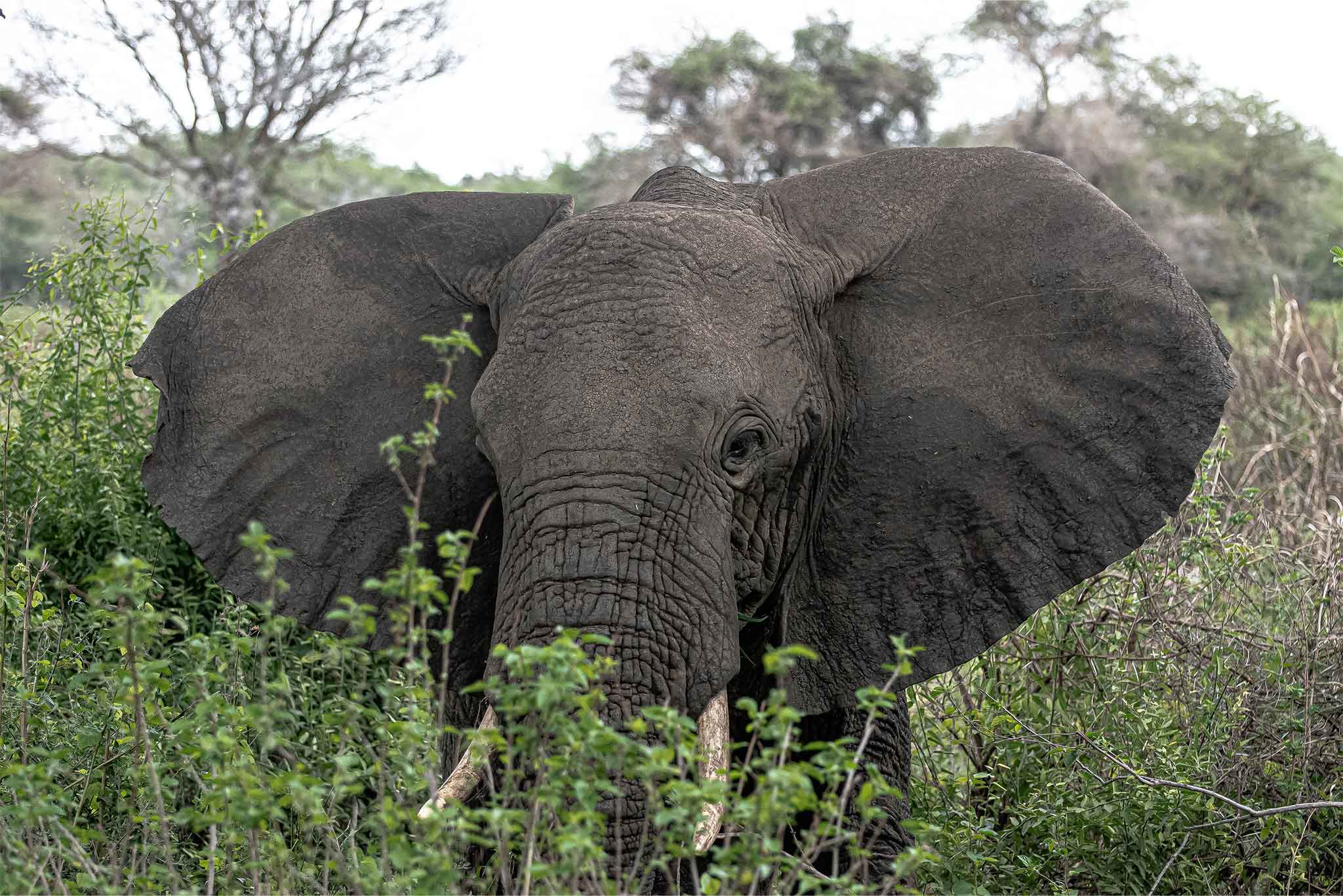 Groundwater Forest Game Drive – Tree-Climbing Lion Territory Enter the park and cruise the lush groundwater forest. Scan the sausage trees and acacias for the famous tree-climbing lions – entire prides regularly rest 10–15 m high in broad daylight. Blue monkeys crash through the canopy while elephant families feed quietly below.