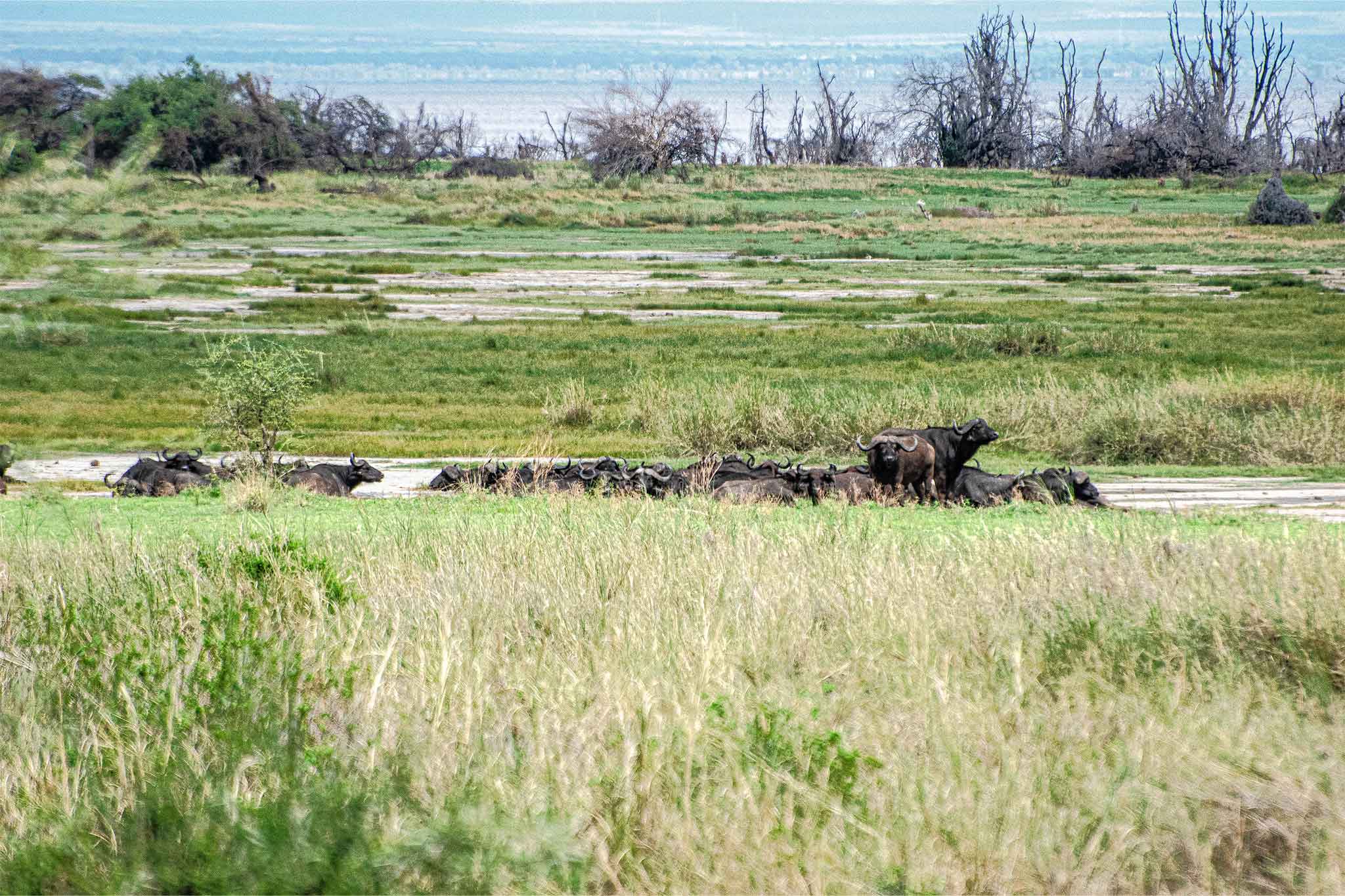 Soda Lake Shore Drive – Flamingo Pink Horizon Drive the lake shoreline as lesser flamingos turn the water bubble-gum pink (millions from June–October, thousands year-round). Pelicans, spoonbills, and yellow-billed storks wade in formation. Cape buffalo herds of 1,000+ animals graze the floodplains.