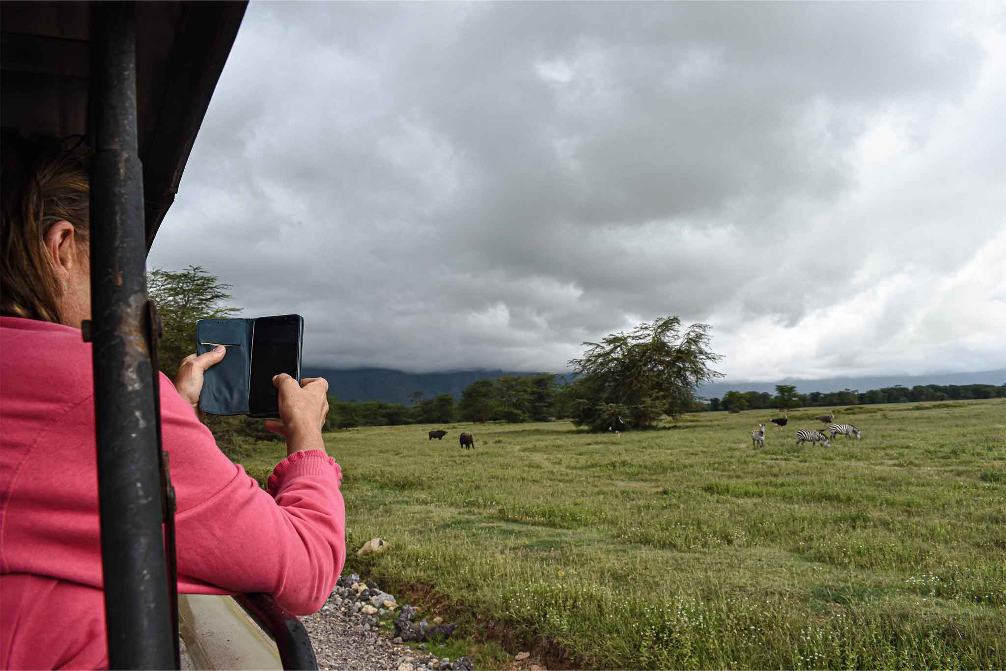 Geography & Access Terrain: Short-grass plains, acacia woodlands, soda lakes, fever-tree forests, freshwater swamps, and highland crater rim. Altitude Range: Crater floor 1,700–1,800 m (5,580–5,900 ft); rim 2,300–2,400 m (7,550–7,870 ft). Travel Times (from Arusha): 3–3.5 hours to crater rim; 20-minute descent road to floor. Gateway: Kilimanjaro International Airport (JRO) → Arusha (45 min private transfer). Year-round access via private pop-up roof 4×4; dry season (June–October) concentrates wildlife around permanent water for dust-free Big Five photography, while green season (January–March) turns the floor emerald, brings newborn calves, dramatic storms, and 20–30 % fewer vehicles.